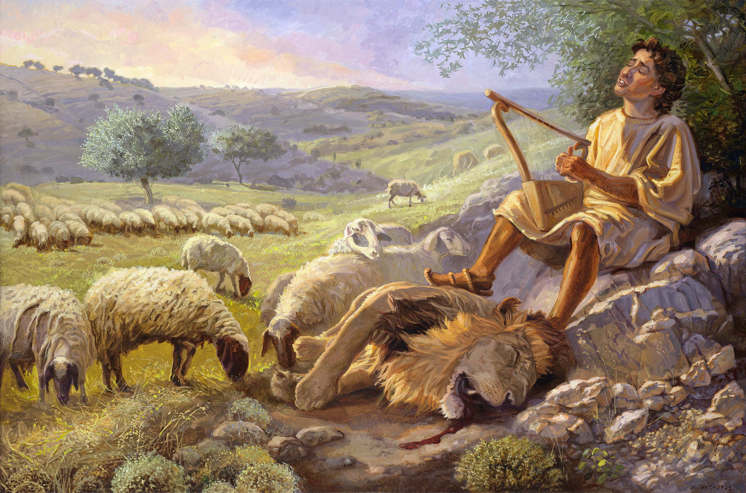 David speelt op de harp (kinnor) en zingt daarbij (1 Samuel 16 vers 18). In het boek Psalmen zijn 72 psalmen opgenomen die hij heeft geschreven. Een toepasselijk voorbeeld is Psalm 23, een psalm met als thema: ‘De HEERE is mijn Herder’. Het vertrouwen op de Herder is niet naïef of gemakkelijk. Het gaat om het persoonlijk kennen en volgen van de HEERE, ook in concreet doodsgevaar.