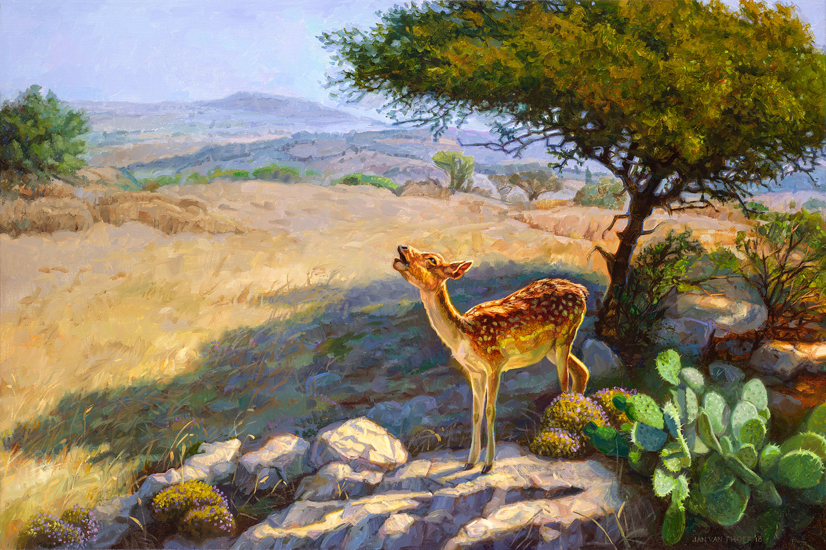Het schilderij toont een hert dat schreeuwt om water in de uitgedroogde omgeving van een heuvel in het noorden van het land Israël.