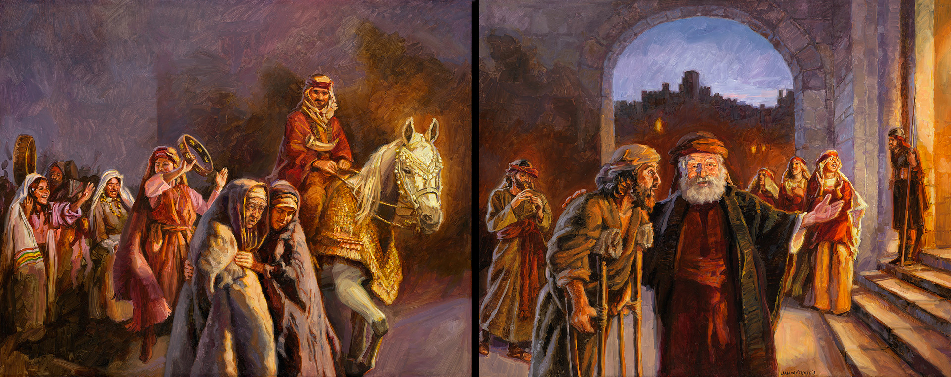 De gastheer wordt boos en laat zijn dienaars naar de straten en kruispunten gaan om ieder die zij aantreffen - bedelaars, misvormden, blinden, verlamden, slechte en goede mensen - te nodigen tot het feestmaal / de bruiloft.