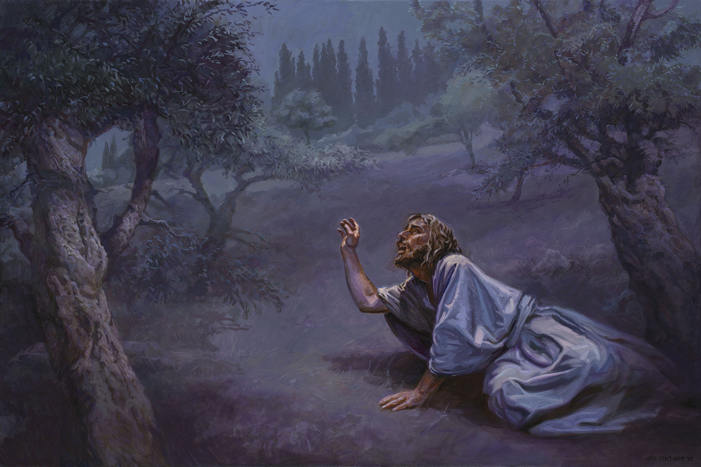 В саду Иисус хочет помолиться. Он отдаляется от своих учеников, становится очень грустным и испуганным. Полностью осознавая грядущие страдания, Он падает на землю и молит Отца Своего, не могут ли они пройти мимо Него. Но тут же добавляет: «Но не то, что Я хочу, но то, что Ты».