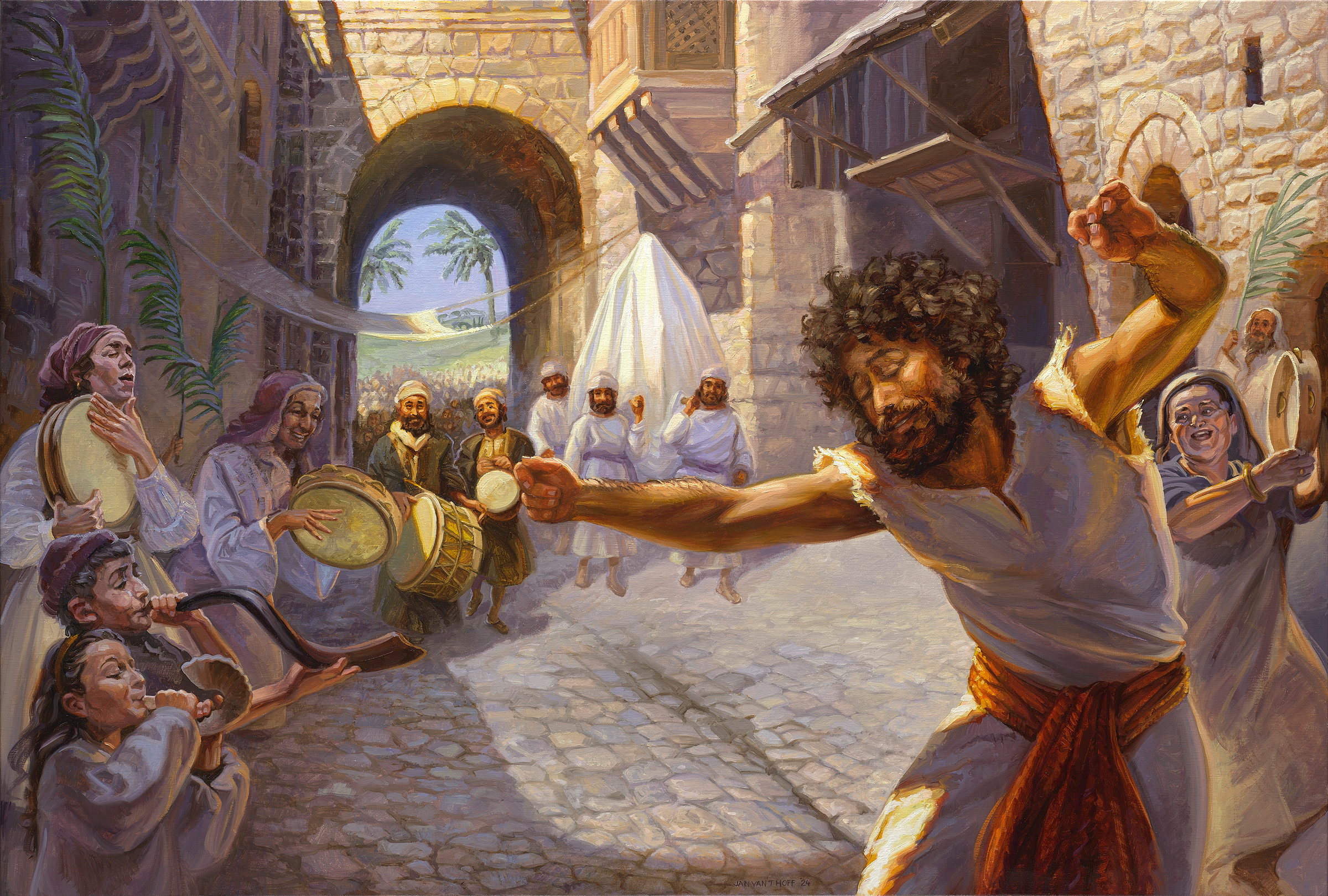 В картине акцент ставится на переживании радости Давида в присутствии Бога и в глазах простых людей. См. стих 22.