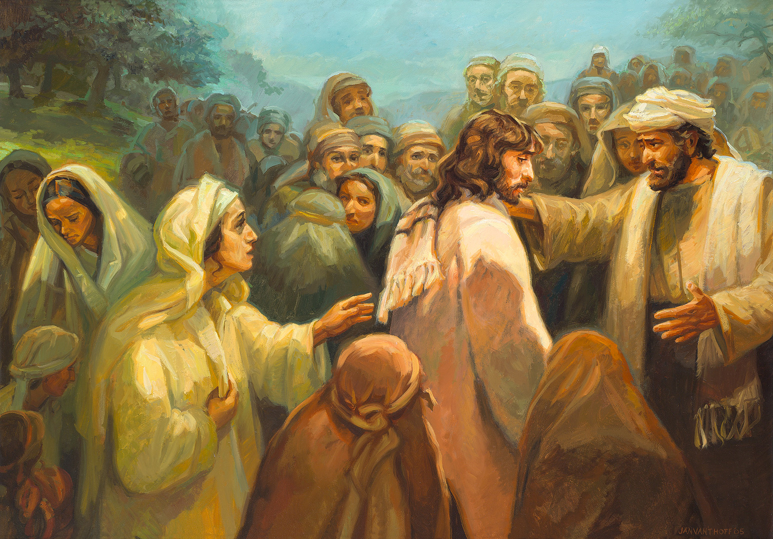 Иаир умоляет Иисуса прийти к нему домой, где его 12-летняя дочь тяжело больна. Тем временем женщина тайком прикасается к краю одежды Иисуса. Она верит, что даже прикоснувшись к его одежде, она исцелится от кровотечения.