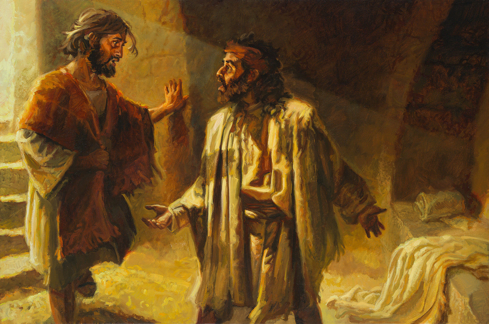 Иоанна 20 стихи 1 по 10 1 В первый же день недели Мария Магдалина приходит ко гробу рано, когда было еще темно, и видит, что камень отвален от гроба. 2 Итак, бежит и приходит к Симону Петру и к другому ученику, которого любил Иисус, и говорит им: унесли Господа из гроба, и не знаем, где положили Его. 3 Тотчас вышел Петр и другой ученик, и пошли ко гробу. 4 Они побежали оба вместе; но другой ученик бежал скорее Петра и пришел ко гробу первый. 5 И, наклонившись, увидел лежащие пелены; но не вошел во гроб. 6 Вслед за ним приходит Симон Петр, и входит во гроб, и видит одни пелены лежащие, 7 и плат, который был на главе Его, не с пеленами лежащий, но особо свитый на другом месте. 8 Тогда вошел и другой ученик, прежде пришедший ко гробу, и увидел, и уверовал. 9 Ибо они еще не знали из Писания, что Ему надлежало воскреснуть из мертвых. 10 Итак, ученики опять возвратились к себе.