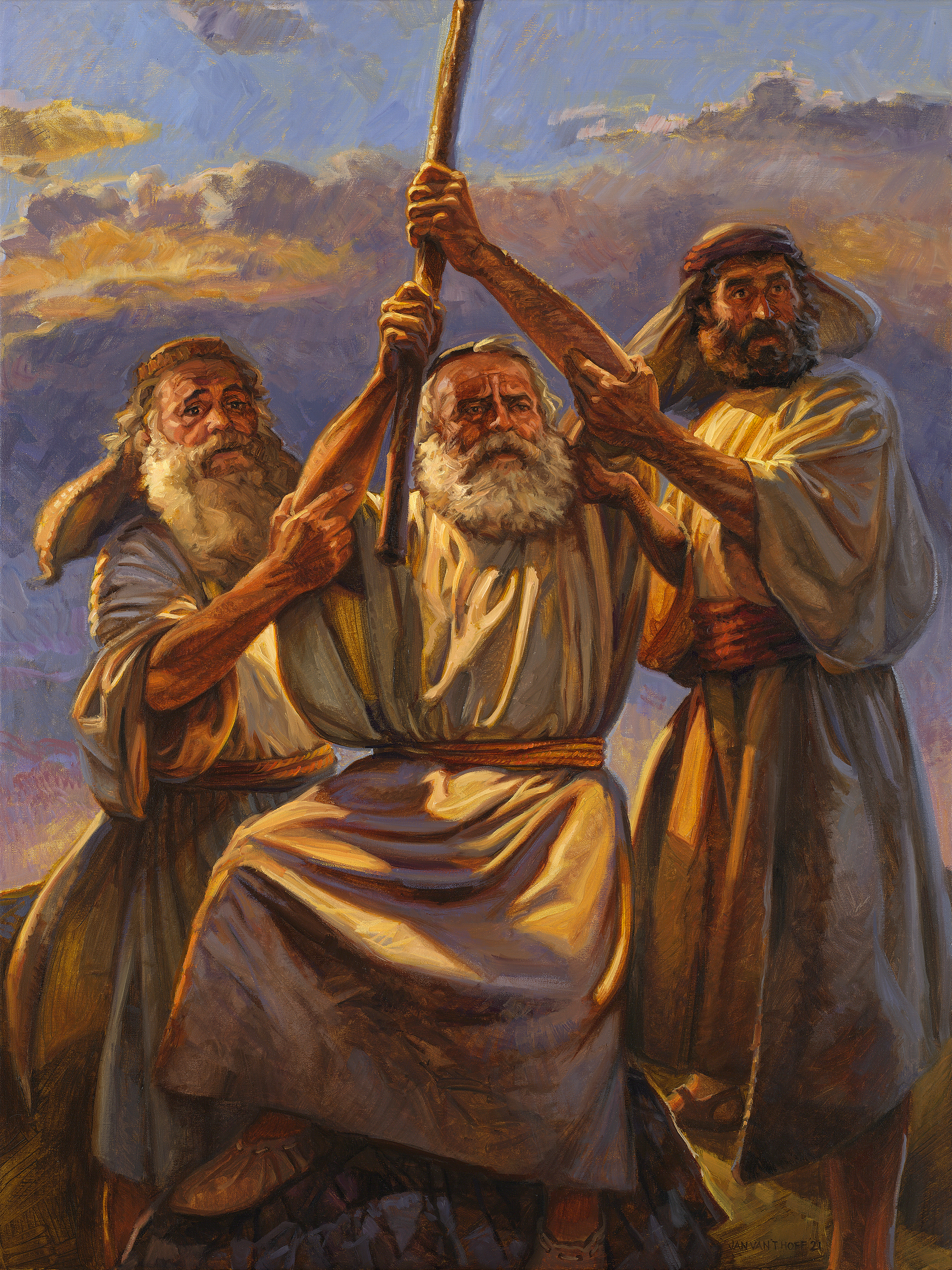 Моисей поручает Иисусу Навину идти войной на Амалика, но победа в этой битве возможна только с Божией помощью. Израиль — народ Божий, и кто воюет против Израиля, воюет против Бога. (стих 16). Моисей держит жезл, с помощью которого Бог совершал многие чудеса в Египте, как знамя/ полевое знамение в бою. Когда Моисей опускает руки с посохом от усталости, амаликитяне побеждают. Аарон и Ор помогают Моисею держать посох. Затем израильтяне побеждают Амалика.